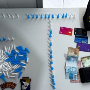 Durante a abordagem, os policiais encontraram 88 pinos de cocaína, 59 embalagens para drogas e R$ 160 em espécie. Um dos suspeitos admitiu que o material seria entregue; já o condutor alegou desconhecer o conteúdo transportado.