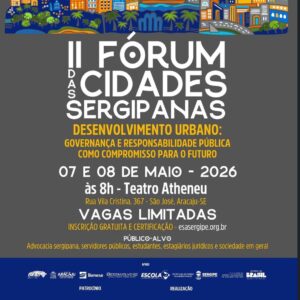 Nos dias 7 e 8 de maio, Aracaju será palco de um amplo debate sobre o futuro dos municípios com a realização do II Fórum das Cidades Sergipanas, no Teatro Atheneu, sempre a partir das 8h. O evento reunirá gestores públicos, empresários, especialistas e profissionais de diversas áreas para discutir soluções estratégicas voltadas ao crescimento sustentável das cidades sergipanas.