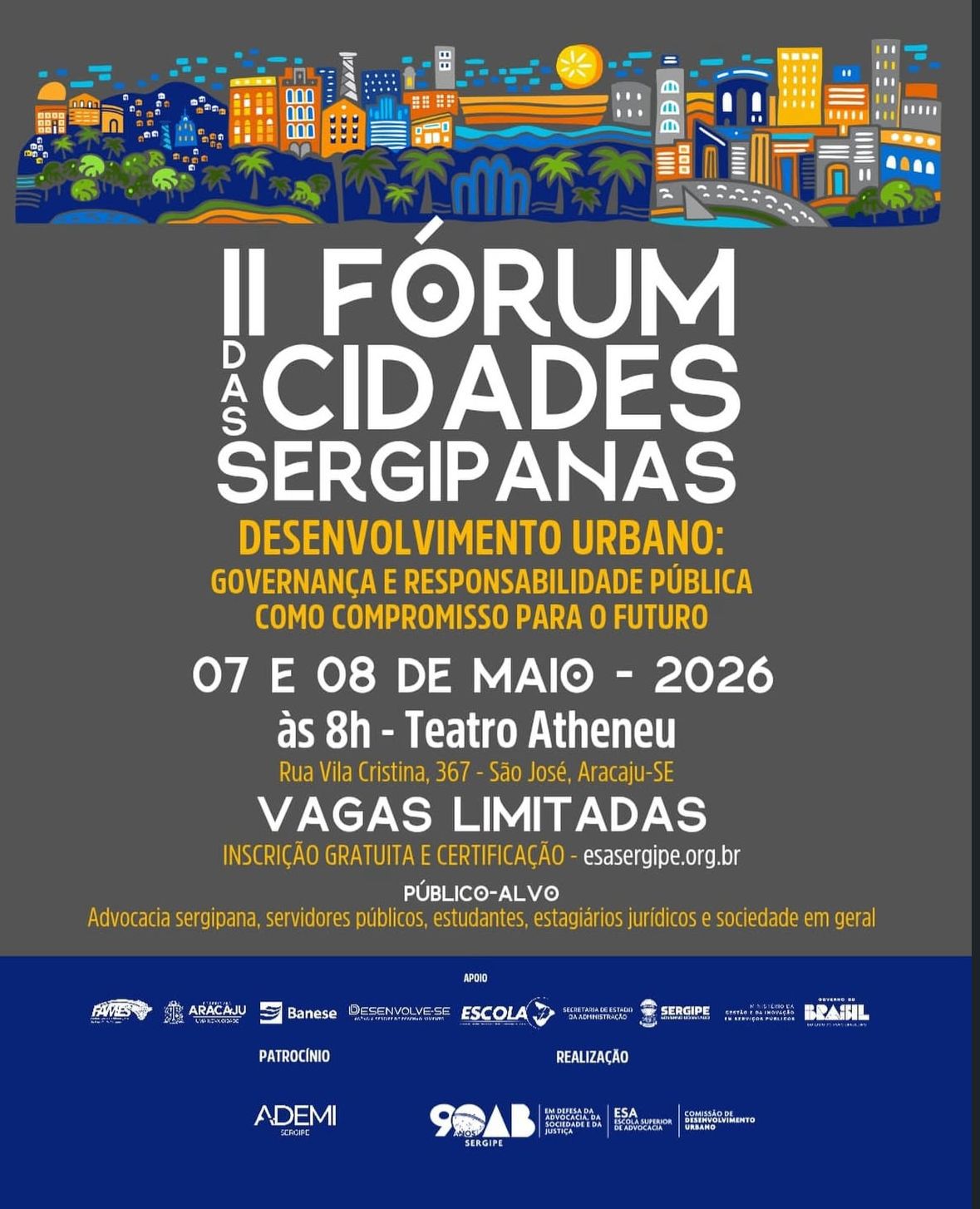 O II Fórum das Cidades Sergipanas é uma realização da OAB Sergipe, por meio da Escola Superior da Advocacia (ESA/SE) e da Comissão de Desenvolvimento Urbano, com apoio de instituições parceiras.