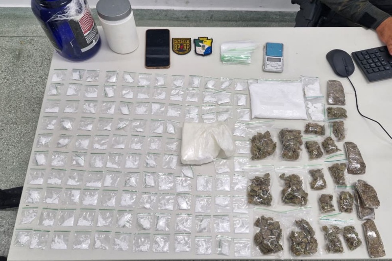 No interior do imóvel, os policiais encontraram entorpecentes já fracionados e prontos para comercialização. Durante a ação, foram apreendidos aproximadamente 646 gramas de cocaína, 270 gramas de maconha, além de um aparelho celular e uma balança digital de precisão.