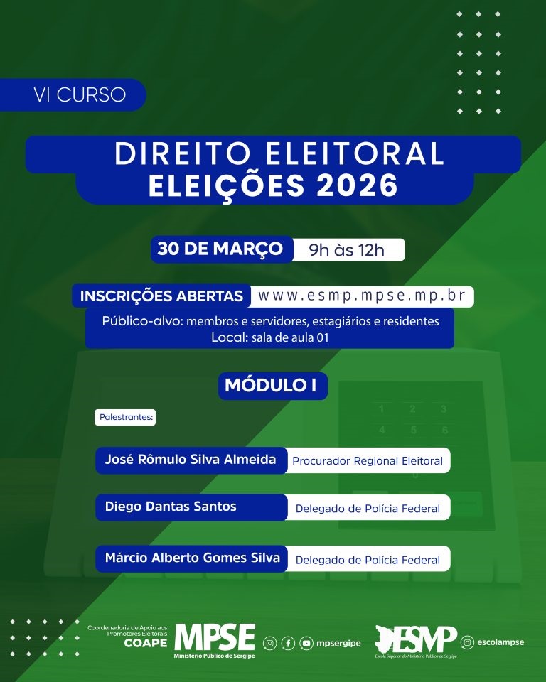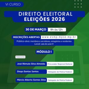A programação do dia inaugural contará com a participação de quatro especialistas com atuação direta na área. O Procurador Regional Eleitoral, José Rômulo Silva Almeida, abordará o tema “O Papel Institucional do Ministério Público Eleitoral nas Eleições Gerais 2026”.