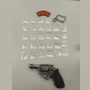 Equipes do 8º Batalhão de Polícia Militar apreenderam um revólver calibre .38 com cinco munições e 28 papelotes de cocaína no Bairro Dom Luciano, na Zona Norte de Aracaju, no fim da tarde de domingo (15).