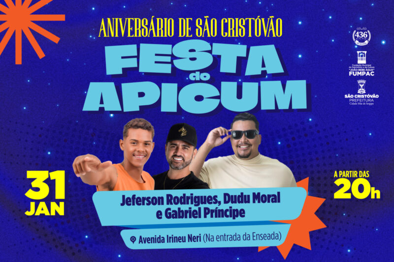 A Prefeitura de São Cristóvão promove, no próximo sábado (31), a Festa do Apicum, encerrando as comemorações pelos 436 anos do município, o quarto mais antigo do Brasil. O evento é organizado pela Fundação Municipal do Patrimônio e da Cultura (Fumpac) e acontece na entrada da Enseada, no bairro Irineu Neri.