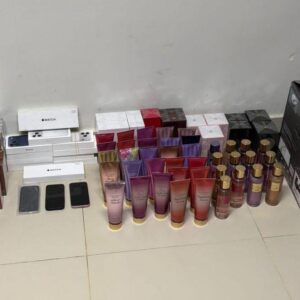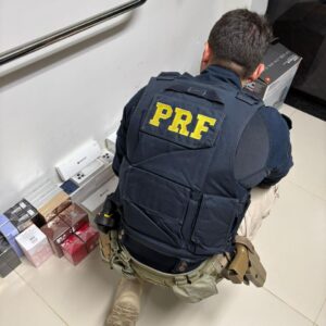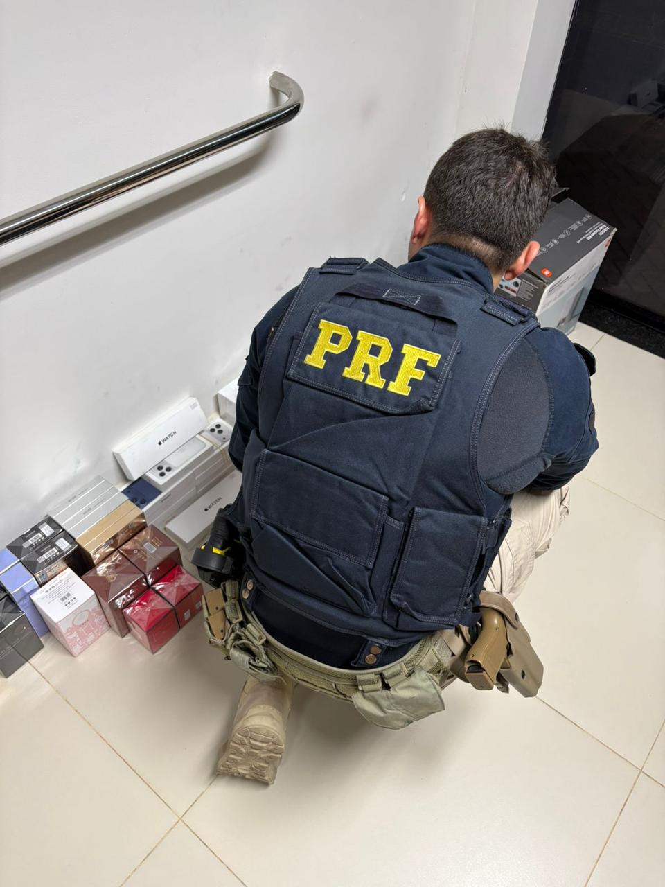 No interior do veículo, os policiais encontraram 12 aparelhos celulares de última geração, dois relógios do tipo smartwatch e 71 itens cosméticos importados, incluindo perfumes, loções e cremes.